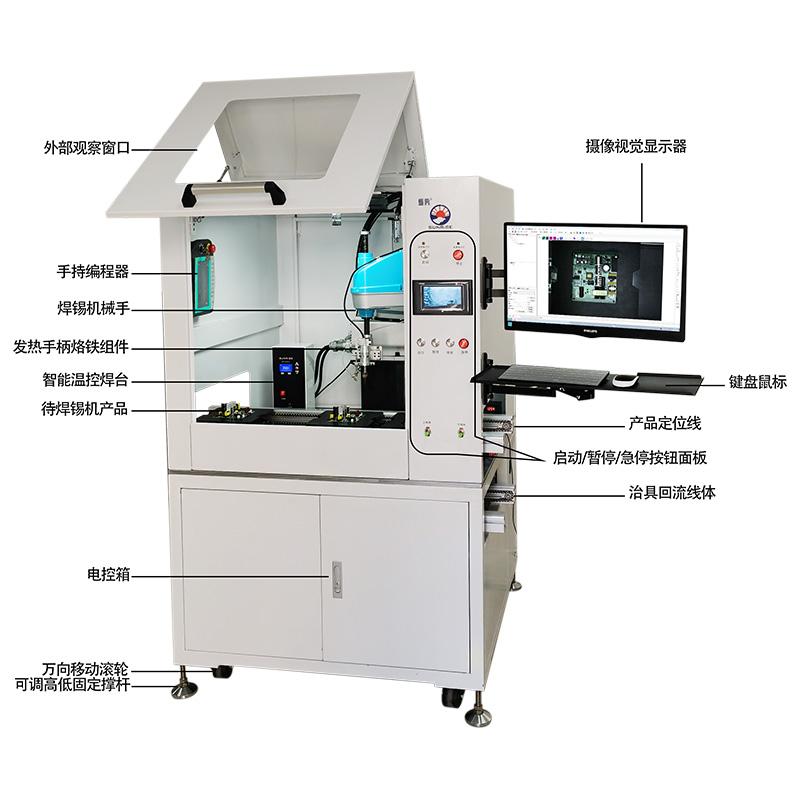 現(xiàn)有CDD攝像頭焊接采用烙鐵機(jī)器人或人工烙鐵的方法,通過送錫絲焊接焊點(diǎn)。烙鐵機(jī)器人或人工烙鐵焊接效率低,良品率低,而烙鐵機(jī)器人或人工烙鐵采用接觸焊接,會(huì)燒壞焊點(diǎn)周圍的黑色塑料,影響產(chǎn)品質(zhì)量。